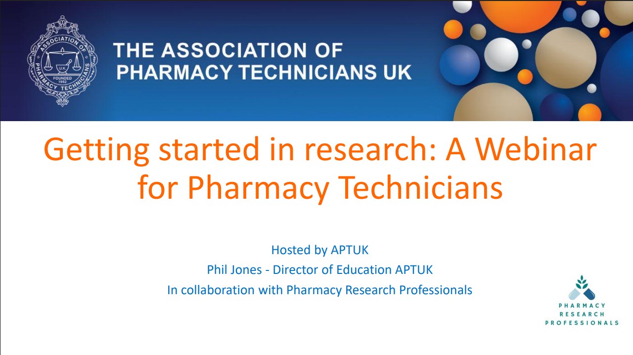 APTUK hosted a webinar in collaboration with Pharmacy Research Professionals on 7th October 2025 You can find the recording here: Getting Started in Research: A Webinar for Pharmacy Technicians You can find the presentation slides here: Webinar presentation slides Getting Started in Research: A Webinar for Pharmacy TechniciansPharmacy Technicians and Research